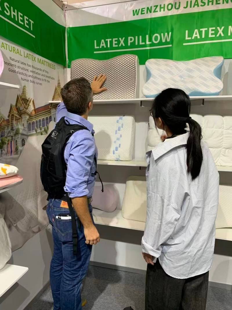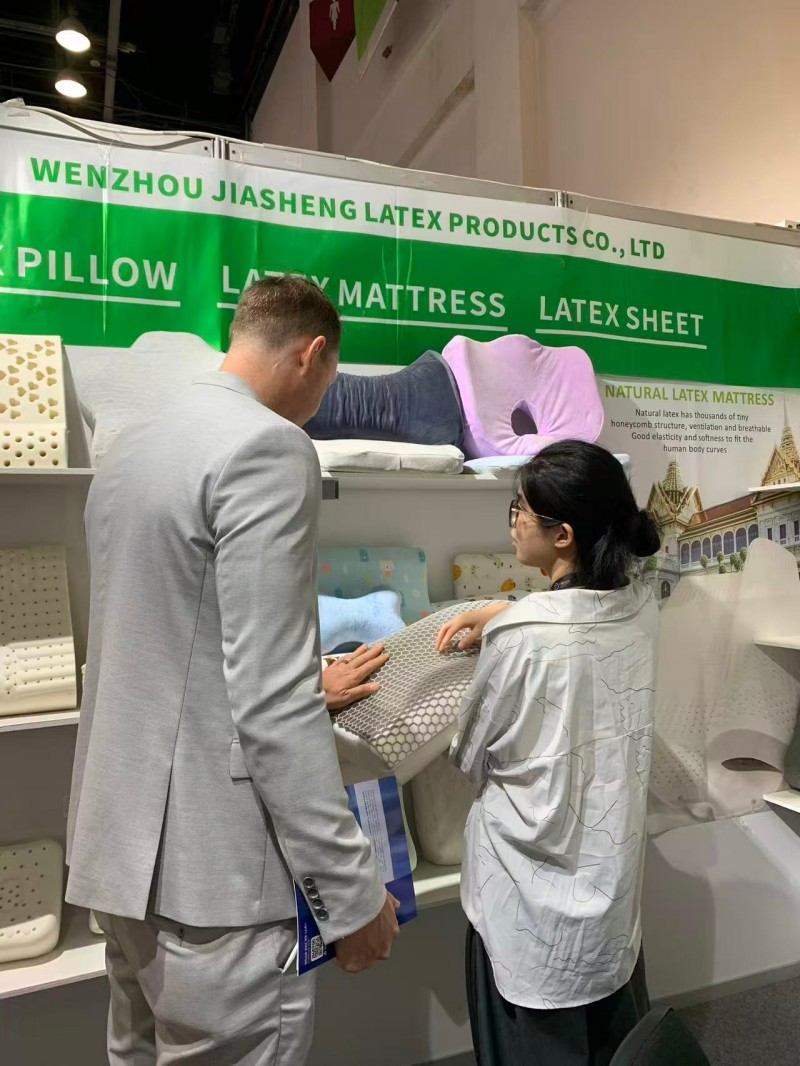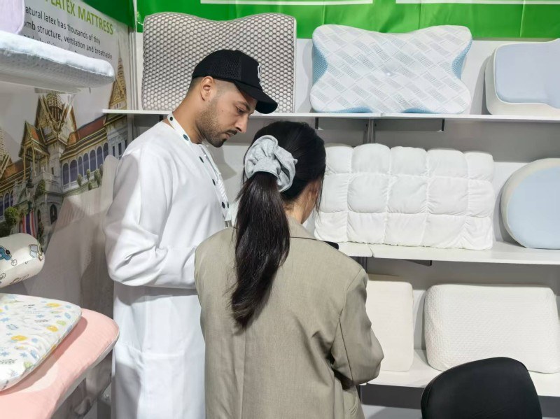 ഈ ദുബായ് സ്ലീപ്പ് എക്സിബിഷനിൽ, ലോകമെമ്പാടുമുള്ള സന്ദർശകർക്ക് ഞങ്ങളുടെ ഉറക്കത്തെ കേന്ദ്രീകരിച്ചുള്ള തലയിണകൾ കാണിക്കുന്നതിൽ ഞങ്ങൾക്ക് ബഹുമതിയുണ്ട്. വിപണിയിൽ ഏറ്റവും കൂടുതൽ വിറ്റഴിക്കപ്പെടുന്ന രണ്ട് തലയിണകൾ അവതരിപ്പിക്കാൻ ഞങ്ങൾ പ്രതിജ്ഞാബദ്ധരാണ്:സ്വാഭാവിക ലാറ്റക്സ് തലയിണആധുനിക സ്മാർട്ട് മെറ്റീരിയലുംമെമ്മറി നുരയെ തലയണ. ലാറ്റക്സിൻ്റെ പെട്ടെന്നുള്ള റീബൗണ്ട്, അലർജി വിരുദ്ധ ഗുണങ്ങൾ ലാറ്റക്സ് പ്രേമികൾ വളരെയധികം ഇഷ്ടപ്പെടുന്നു. അതേസമയം, മെമ്മറി നുരയുടെ ആത്യന്തിക ഫിറ്റ് ആഴത്തിലുള്ള ഉറക്കം പ്രദാനം ചെയ്യും. സൈറ്റിലെ ഉപഭോക്താക്കളുമായുള്ള ഞങ്ങളുടെ ആഴത്തിലുള്ള ആശയവിനിമയം അവരുടെ തലയിണകളെ പിന്തുടരുന്നതായി ഞങ്ങൾക്ക് തോന്നി. വ്യത്യസ്ത ഉറക്ക ശീലങ്ങൾക്കായി വ്യക്തിഗതമാക്കിയ ചോയ്സുകൾ നൽകുന്നത് ഗുണനിലവാരമുള്ള ഉറക്കത്തിൻ്റെ താക്കോലാണെന്ന് ഞങ്ങൾ ഉറച്ചു വിശ്വസിക്കുന്നു.